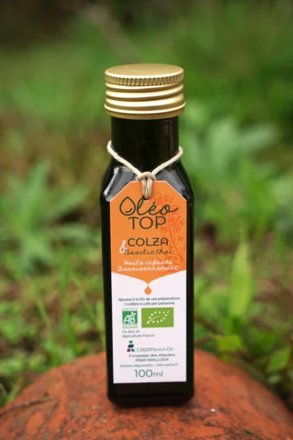L'huile de cameline a des senteurs très vertes, d'herbes coupées, relevées par un goût alliacé de cébettes. J'ai créé 3 assemblages : Verveine, Basilic citronné ou Fenouil.